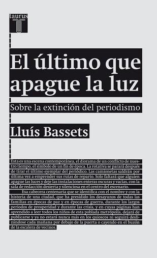 Con realismo y precisión, respaldado por el bagaje de cuarenta años de experiencia en la primera línea del periodismo y una mirada lúcida y valiente, Lluís Bassets escribe la crónica de los últimos días de la prensa escrita. ¿El estallido de la "burbuja periodística" será también la definitiva señal del fin de la cultura y la democracia tal y como las conocemos? ¿Hacia dónde nos lleva la "efervescencia digital"?