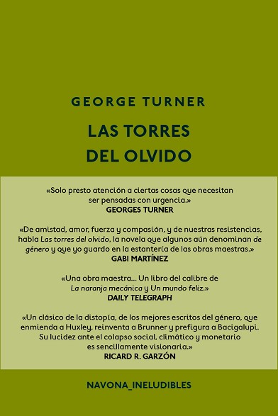 "Si George Turner lo publicó en 1987 y su propuesta continúa tan vigente, será porque se trata de un clásico. Dicen que Las torres del olvido es una novela de ciencia ficción. Algunas etiquetas la distinguen como «la primera gran novela del subgénero cambio climático». Son formas de hablar sobre una obra que anticipó con inquietante exactitud el mundo que está llamando a nuestra puerta." Gabi Martínez