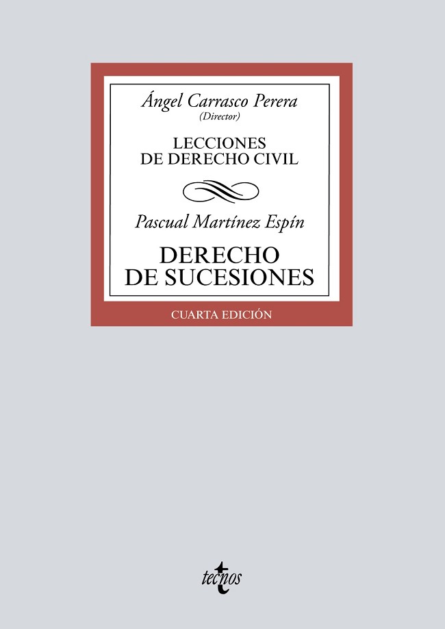 El Derecho de Sucesiones escrito por el Catedrático Martínez Espín pretende ser un texto de referencia tanto para estudiantes de Grado en Derecho y Doble Grado (Derecho y otras titulaciones), como para profesionales -sean jurídicos o no-. Esta obra tiene por objeto ofrecer una visión completa, didáctica y actual sobre los aspectos esenciales del Derecho de Sucesiones. La obra no se limita ser manual al uso, sino que pretende contar de una manera sistemática los contenidos básicos de la sucesión mortis causa. Para lograr este objetivo, se han utilizado técnicas diferentes. En primer lugar, se reduce en la medida de lo posible la glosa de normas jurídicas en el cuerpo de texto de enseñanza, gracias a los cuadros que preceden al desarrollo de cada epígrafe. En segundo lugar, se atiende a lo esencial, sin disquisiciones doctrinales o jurisprudenciales. En tercer lugar, cada epígrafe está compuesto por varios párrafos con un título que sintetiza la idea central, con la finalidad de que el lector distinga los contenidos de cada pregunta. En cuarto lugar, las cuestiones más relevantes se contienen en esquemas. Por último, en un cuadro final se sintetizan los conceptos y reglas jurídicas más significativas de cada lección.